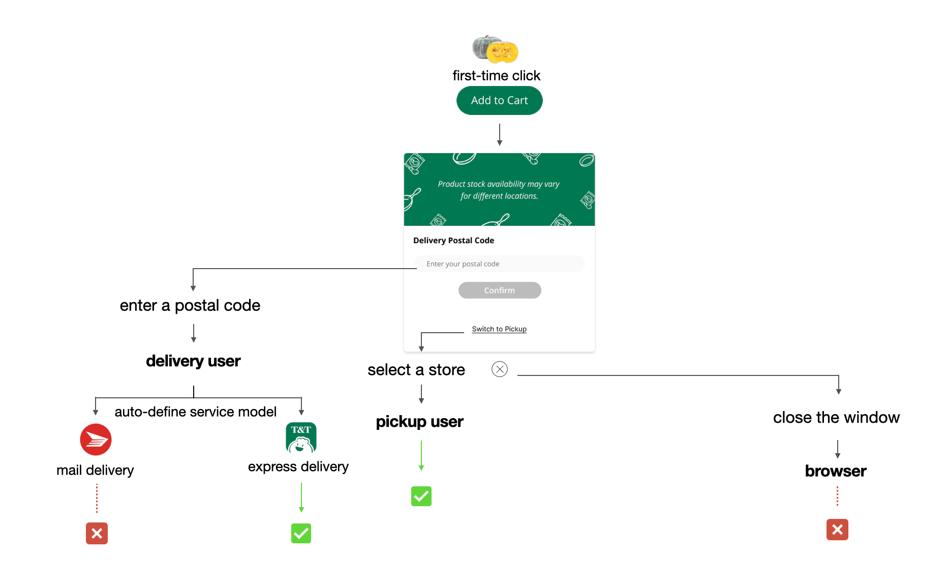 For those who don't allow location access, we redesigned the workflow. Now, when a customer clicks "add to cart," a modal pops up asking for their postal code. We use this information to allocate them to the respective store.